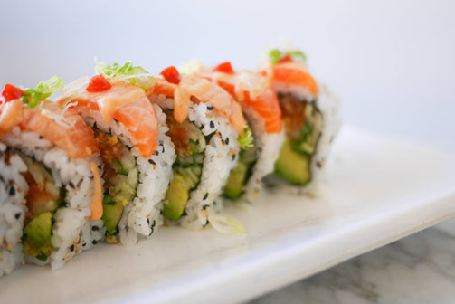 Spicy Salmon, Avocado, Cucumber Topped with Torched Salmon